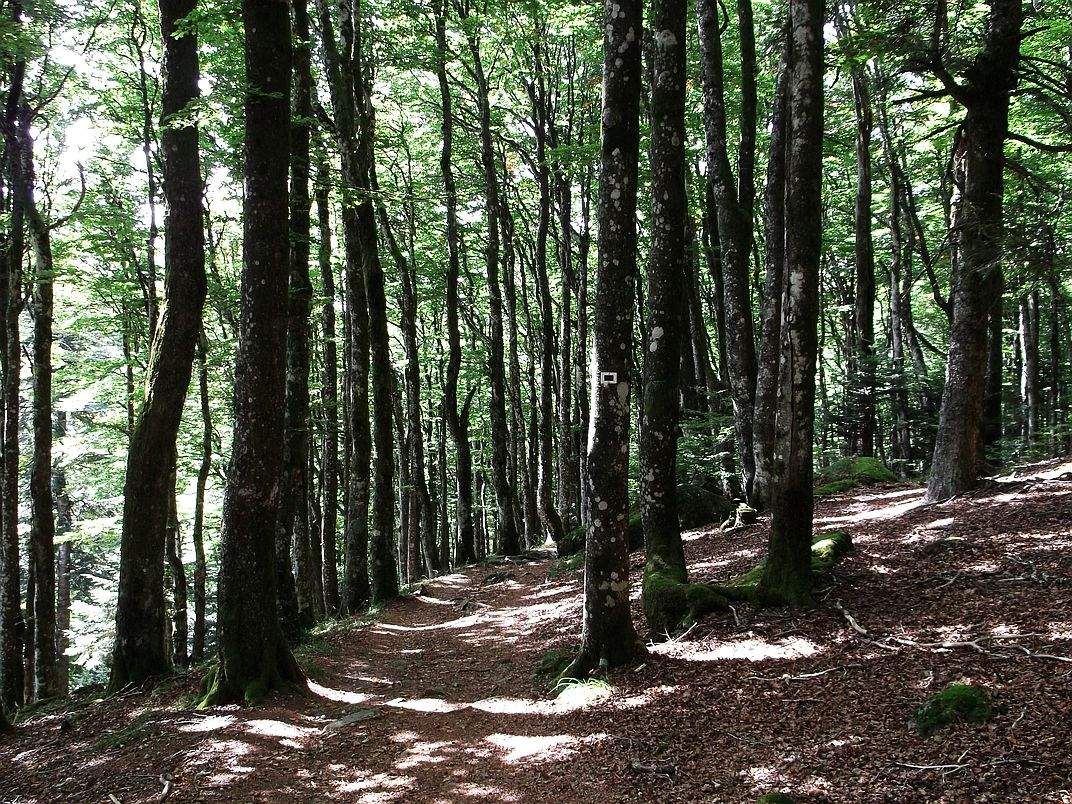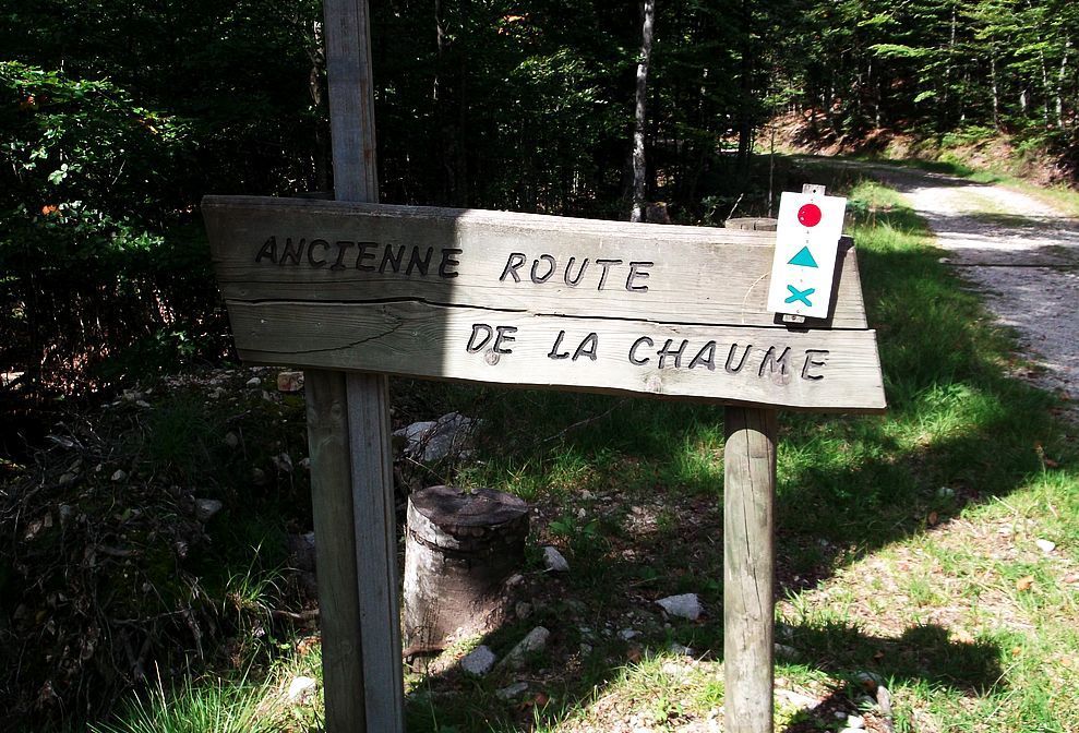Retour sur le large chemin forestier, et début de la vraie montée ! Un peu plus haut, on part sur la droite, après avoir traversé le ruisseau, et un sentier a remplacé le chemin. Il grimpe bien et est rocheux, mais un petit sentier sur la gauche permettra d’y échapper un moment. Retour sur le chemin, et on longe deux parcelles engrillagées, qui sont juste des captages d’eau. Un peu après, au croisement, prendre le chemin qui part sur la droite, repéré par plusieurs signes, en plus de notre « disque rouge ». On arrive bientôt sur une route macadamisée, et ainsi se termine l’ancienne route de la Chaume.