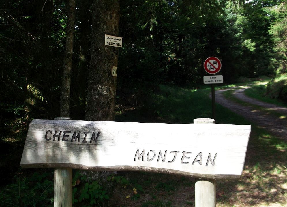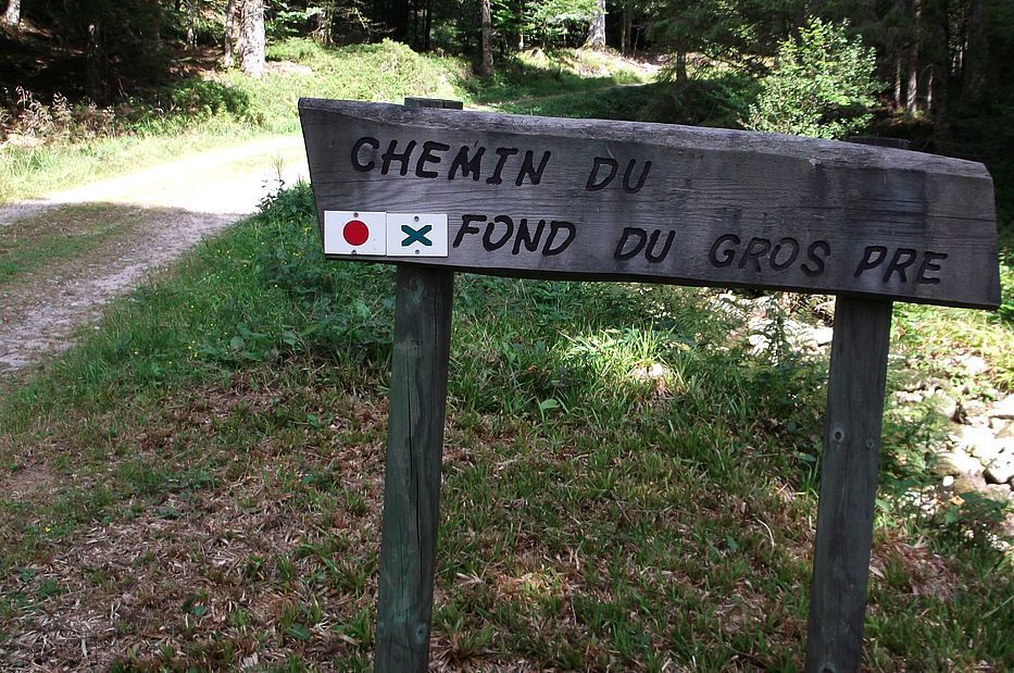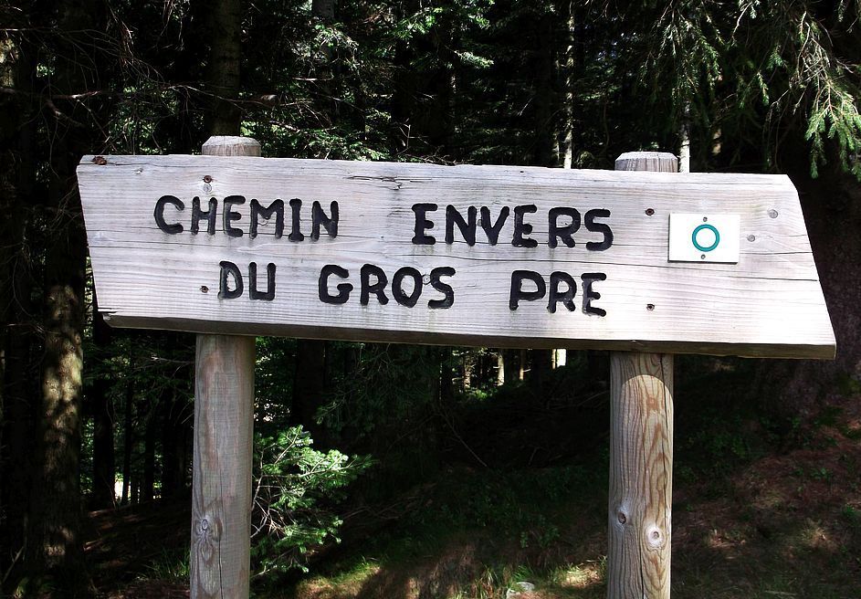 Le Gros Pré est le nom des anciens pâturages à droite du chemin, aujourd’hui presque tous à l’abandon. Le secteur est particulièrement beau et agréable ; la route goudronnée se prolonge par un chemin de terre, repéré par un « anneau vert », avec un banc voisin terminent. Nous montons dans le vallon du Ruisseau de Ventron, sur un magnifique chemin baptisé « Chemin envers du Gros Pré » !