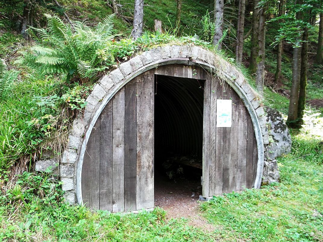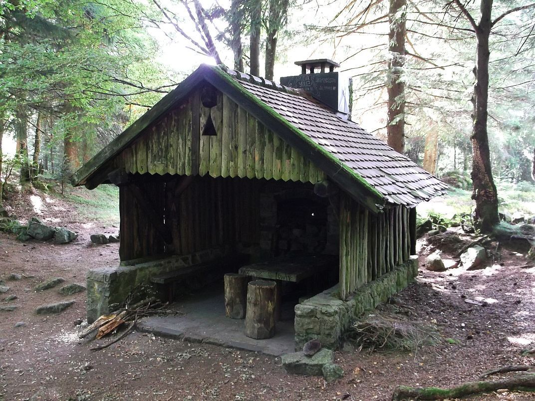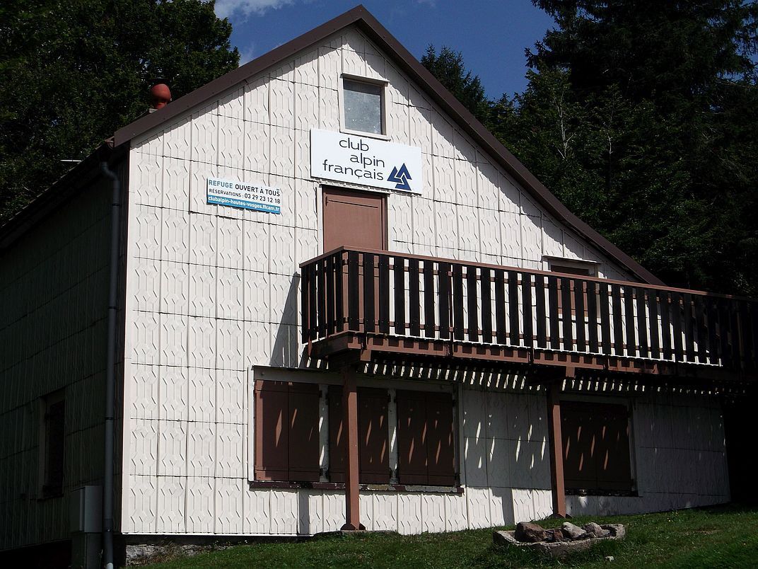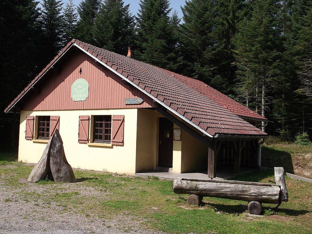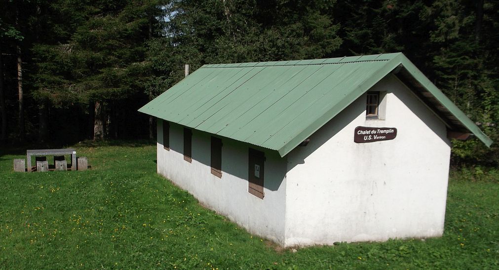Avant de démarrer la rando, nous prendrons quelques minutes pour explorer ce qu’il y a juste après le col, côté vosgien donc. Sur la droite, une petite croix (1), un abri de fortune datant peut-être de la Première Guerre Mondiale (2), et un monument en souvenir des libérateurs de Ventron et du col. Sur la gauche, un refuge baptisé « Chalet du Tremplin », propriété de l’US Ventron (3). C’est justement derrière ce chalet que commence la balade, en suivant le « rectangle bleu-blanc-bleu », direction Ventron et Musée du Textile.