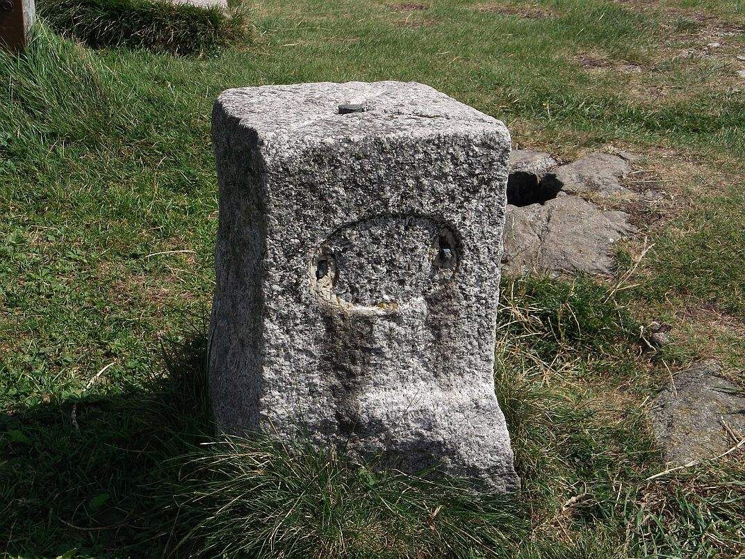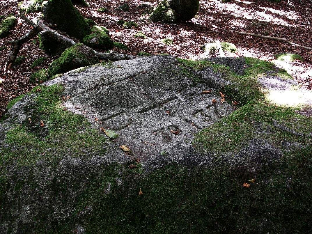 La descente se poursuit, et elle est magnifique ! Un peu plus bas, dans la forêt, alors que les pierres du mur sont bien visibles, on arrive à une borne frontière totalement unique, les inscriptions ayant été gravées dans un gros rocher !