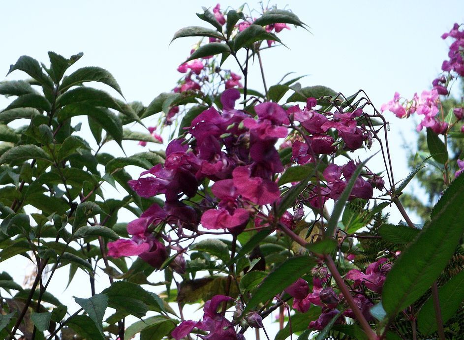 On arrive sur un large chemin ; le sentier continue en face, mais on récupère vite le chemin, plutôt rocheux et en descente. On arrive sur une petite route goudronnée : il suffit de la traverser et le sentier continue 10 m au-dessus. Une passerelle en bois, recouverte d’un grillage antidérapant, est suivie d’un pont, en bois lui-aussi, et ce dernier précède une belle série de balsamines de l’Himalaya, d’un rouge éclatant.