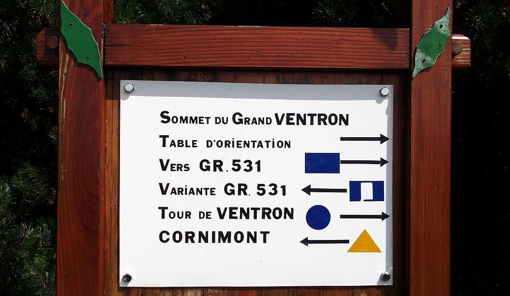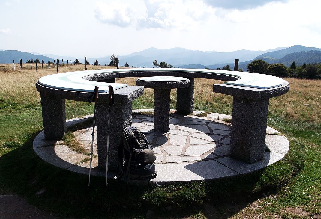 En même pas 10 mn, on arrive au sommet du Grand Ventron (7), altitude 1 204 m (selon la carte IGN) , point le plus haut de cette randonnée : et quelle récompense ! La vue est presque à 360 ° (il manque un petit morceau vers le Nord, caché par la forêt) ; la table d’orientation, panoramique et fort belle, a été réalisée en 1993 par le Conseil Général des Vosges, et est doublée à l’intérieur par une tablette d’information circulaire sur « la chaume du Grand Ventron, une histoire pastorale ». À déguster sur place !