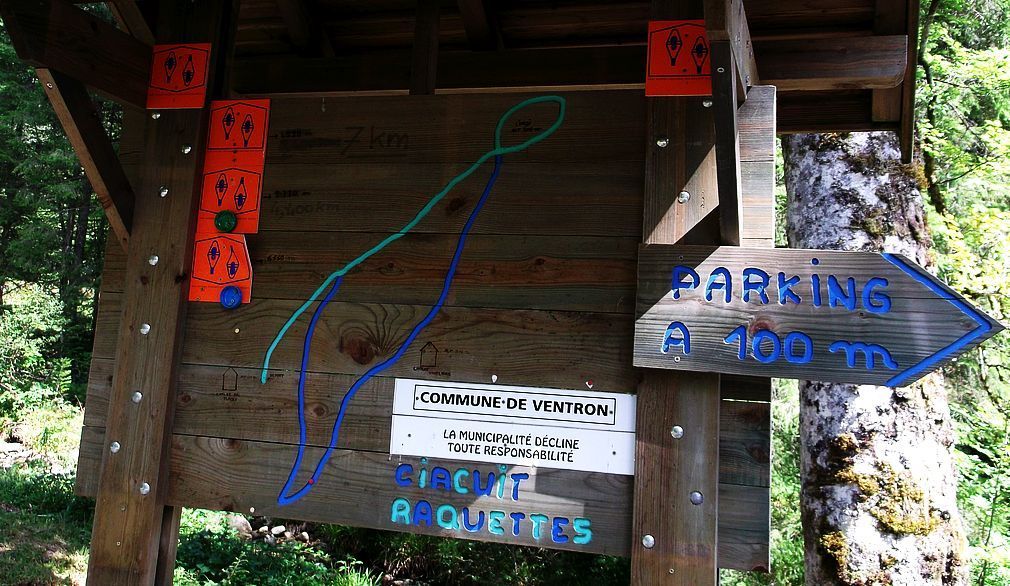 J’ai préparé les bâtons en prévision de la montée, c’est pourtant une descente qui commence, même pas 100 m, en suivant cette petite route goudronnée. On passe sur un pont, et on prend de suite à droite au panneau de départ des pistes de raquette : c’est le chemin du Fond du Gros Pré. Je pense que pour trouver des aménagements comparables, il faudrait aller en Forêt Noire, mais pas dans le Haut-Rhin…