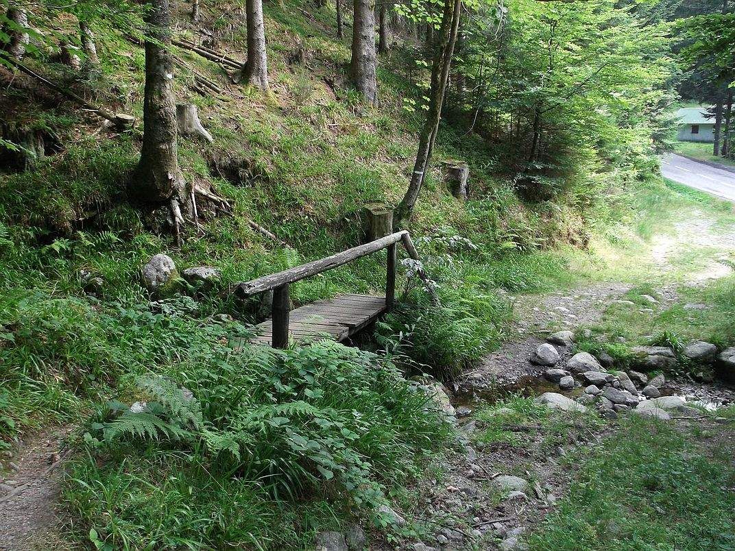 La source ferrugineuse est toute proche, et on fera pour la voir un petit crochet à droite. On passe un petit pont et on arrive au site, fort bien aménagé, avec un panneau explicatif très complet ; les deux arbres qui l’entourent sont des « arbres à vœux », et les gens ont pris l’habitude d’y accrocher des petits bouts de tissus et autres mouchoirs, on se croirait presque au Népal ! Le tout est entretenu par la Communauté de Communes de la Haute-Moselotte.